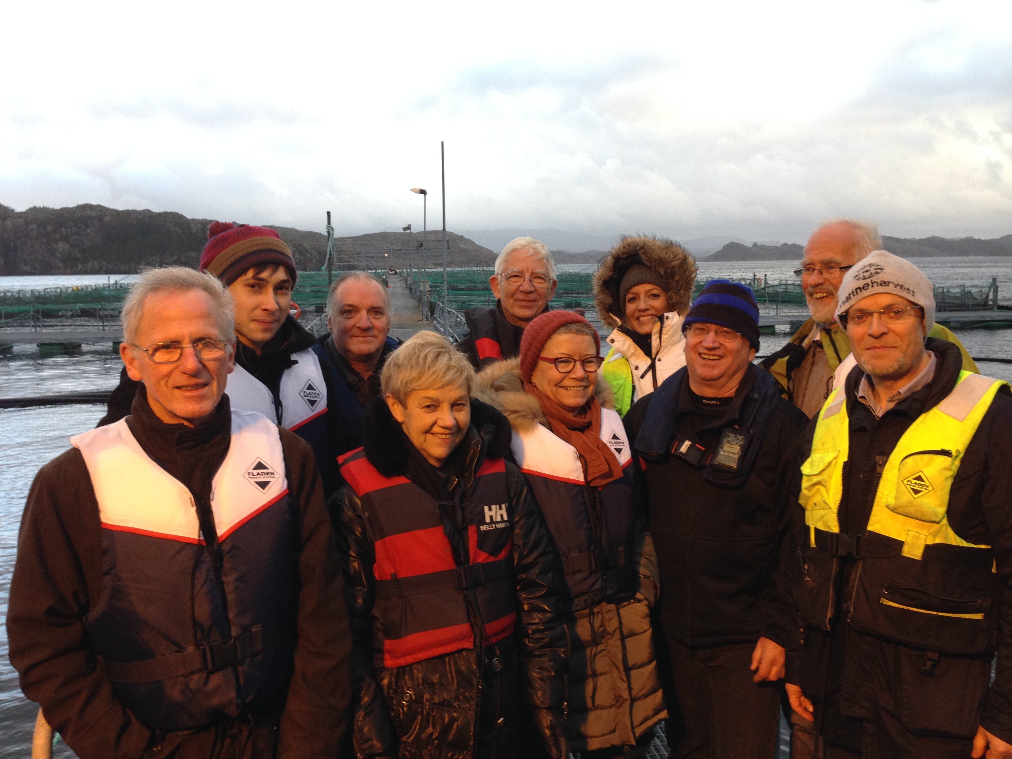Franske journalister og representanter fra franske forbrukerorganisasjoner besøker ett av Marine Harvests oppdrettsanlegg i Bergen i desember 2013. Foto: Norges sjømatråd