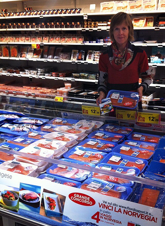 Det var brede smil som møtte meg da jeg tok i mot en gruppe på rundt 20 laks- og ørretoppdrettere fra Vestlandet på flyplassen her i Milano i formiddag. Jeg skulle vise frem noe av det fineste i byen. Nei, ikke Piazza Duomo eller Cenacolo di Leonardo. Målet for dagens besøk var et av de største, og flotteste, hypermarkedene her i Milano: Carrefour Planet på MilanoFiori. Der har de et fantastisk utvalg av sjømat av alle slag – og norsk laks har fått betydelig plass i kjølediskene.
