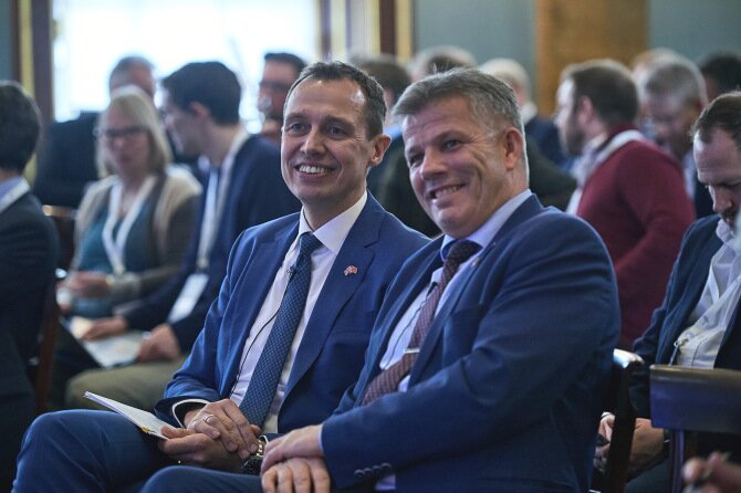 Fiskeri- og havminister Bjørnar Skjæran og Christian Chramer under Norway UK Seafood Summit i London