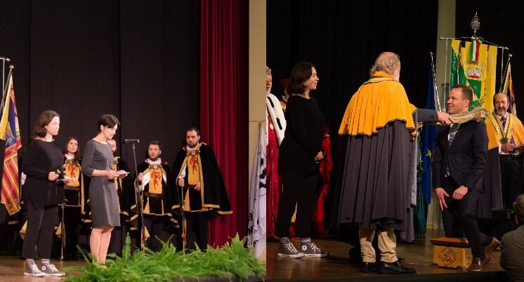 Den norske ambassadøren i Roma, Margit F. Tveiten, holder tale, og fylkesrådsleder Tomas Norvoll blir slått til tørrfisk-ridder