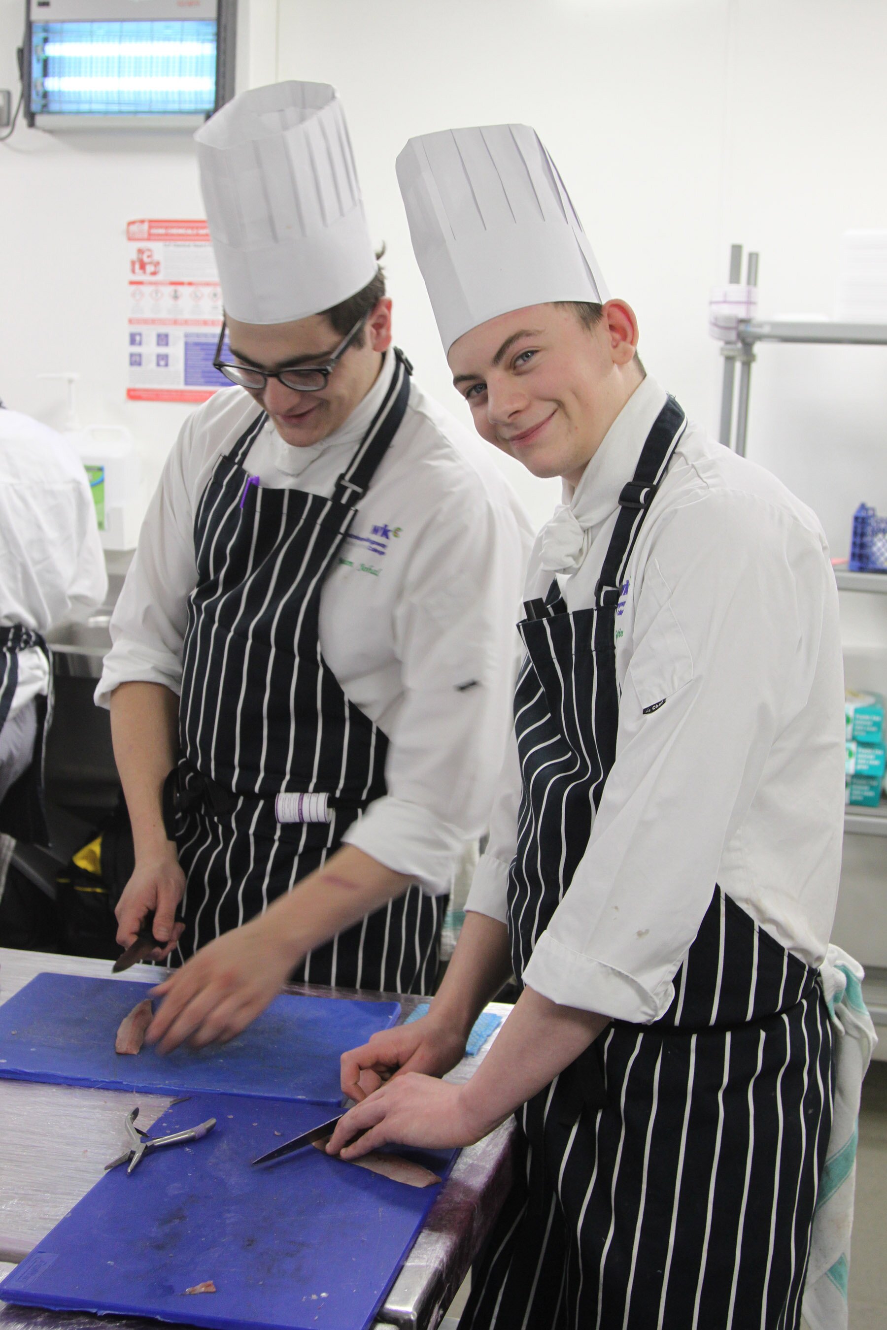 Finbar står sammen med vennen Nahum Johal (20) på skolens grovkjøkken og bearbeider sild som skal anvendes i en sildesalat som serveres i skolens egen restaurant. Med en sylskarp kniv og tang renskjæres sildefiletene, før de ørsmå beinene nappes ut ett etter ett.