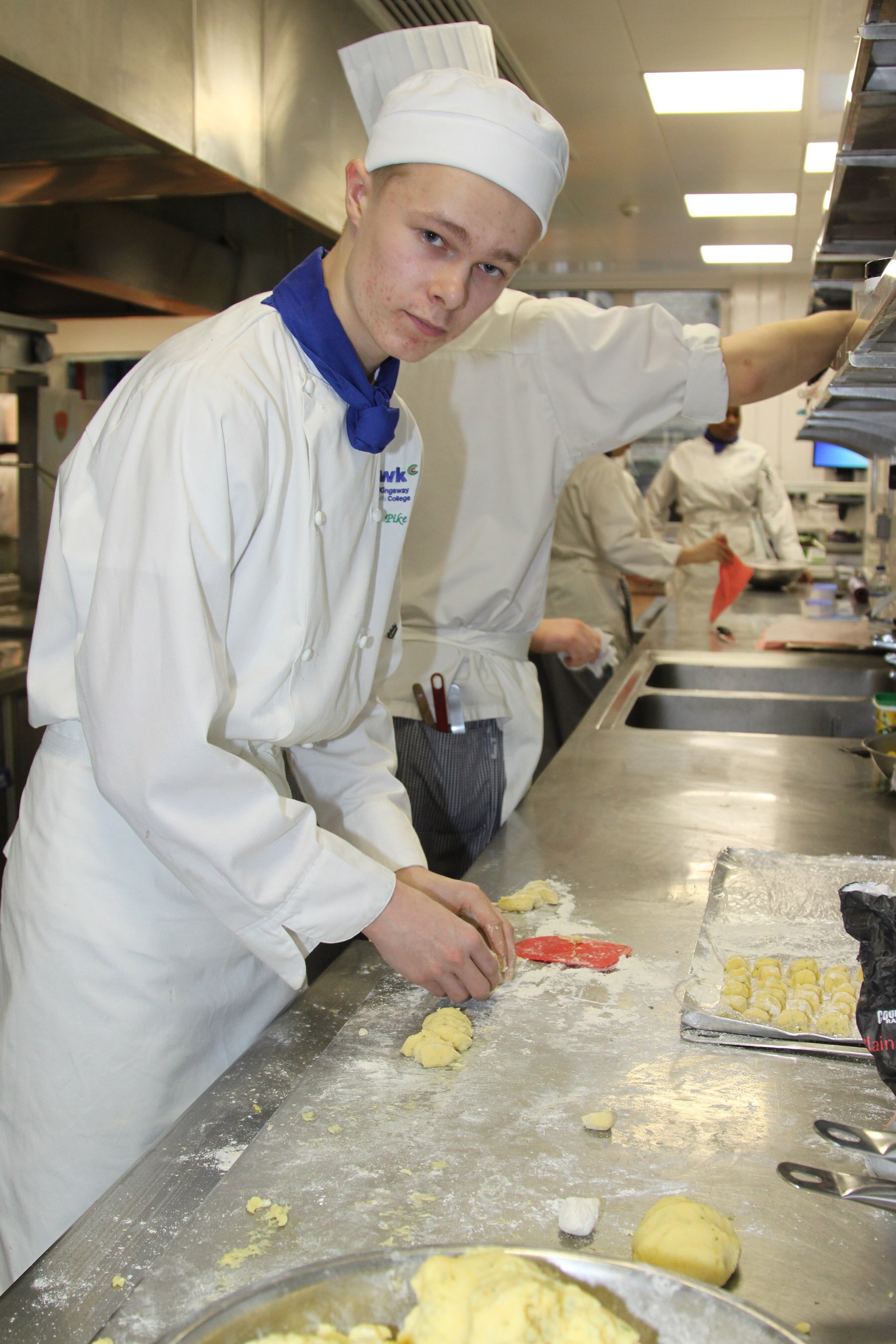 Gnocchi: Når en komplett meny skal settes sammen er det mange elementer som må forberedes og tilberedes. Jamie Pike (17) har ansvaret for dagens tilbehør og lager gnocchi, en blanding av poteter, mel og krydder som skal en snartur innom grytene før de serveres.(Foto: Geir Håvard Hanssen).