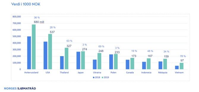 Som i fjor var Hviterussland og USA de største markedene, hvor eksporten av norsk ørret kom på henholdsvis 680 millioner og 537 millioner kroner.