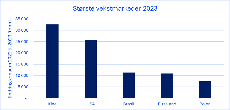 Estimert konsum i Polen økte med 7500 tonn i 2023, dette tilsvarer hele 14 prosent vekst fra 2022. Det plasserer Polen på en 5. plass i oversikten over største vekstmarkeder. For bearbeidingsmarkeder som Polen er det utfordrende å beregne konsumet presist. Unøyaktigheter både i handelsstatistikk, omregningsfaktorer og endringer i lager kan påvirke resultatet.