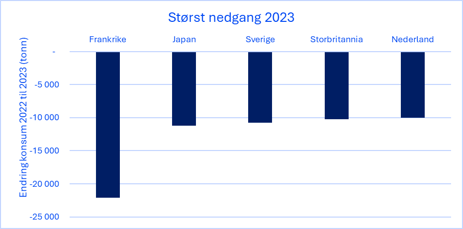 Nederland er et marked med høy bearbeiding og re-eksport, og estimatene derfra er mer usikre. Fra våre hjemmekonsumtall ser vi imidlertid den samme nedgangen i konsum i 2023 som våre estimater.