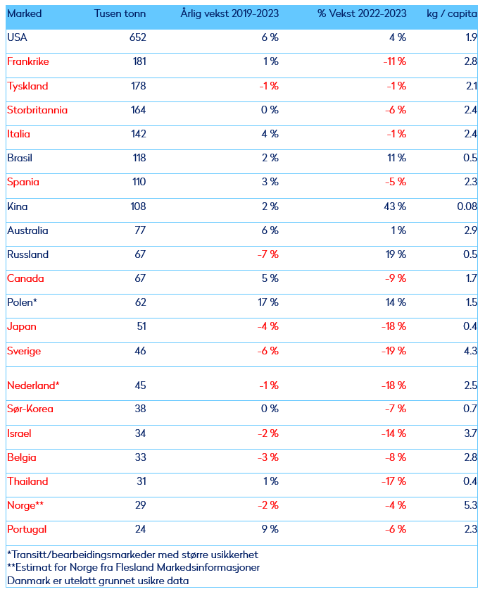 Alle land merket i rødt hadde en nedgang i konsumet i 2023. På topp har vi som vanlig USA, som befester sin dominans som verdens desidert marked for atlantisk laks, og fortsetter den solide veksten vi har sett over flere år. Alle de fem store europeiske markedene (Frankrike, Tyskland, Storbritannia, Italia og Spania) hadde en nedgang i konsumet fra 2022 til 2023. Siden 2019 har imidlertid både Italia og Spania utmerket seg med en solid konsumvekst.
