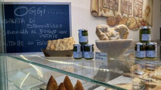 Fra vinduene til en vakker gammel murbygning, ved en liten «piazza» av brustein som er blankslipt av tråkk fra skosåler, kjerrehjul og gummidekk gjennom flere hundre år, sprer det seg en aromatisk duft av hvitløk, basilikum, solmodne tomater og tørrfisk fra Norge.