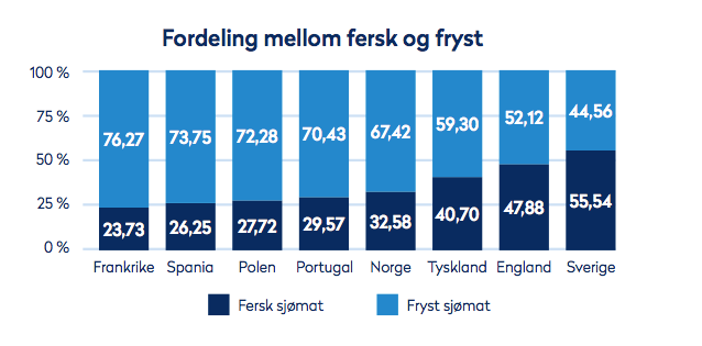 Sjømat blir solgt på svært mange ulike måter rundt om i Europa i dag. I markeder som Spania og Frankrike blir en stor andel av sjømaten solgt i tradisjonelle kanaler og supermarkeder og fiskedisker, mens sjømaten i markeder som Storbritannia er mer spredt mellom ulike supermarkeder og kiosker, og finnes i selvbetjente hyller. Det er også store forskjeller på hvor mye av sjømaten som blir solgt fersk og hvor mye som blir solgt fryst. Som grafen illustrerer blir 76 prosent av sjømaten i Frankrike solgt fersk, mot bare 55 prosent i Sverige (hermetisk er ikke inkludert).