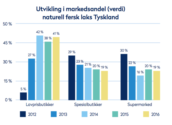 I markeder som Sverige og Tyskland hvor fisk og sjømat tidligere har blitt solgt fra frysedisken, ser vi hvordan produktinnovasjon med fersk ferdigpakket fisk har endret markedet og gitt andelen til lavprisbutikkene et oppsving. Grafen illustrerer endringen i dagligvaremarkedet for fersk laks i Tyskland fra 2012 til 2016. Når fersk fisk ble introdusert på Lidl og Aldi tok lavpriskjedene markedsandeler fra de etablerte kanalene. Teksten fortsetter etter diagrammet