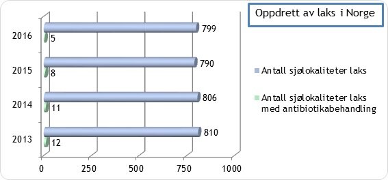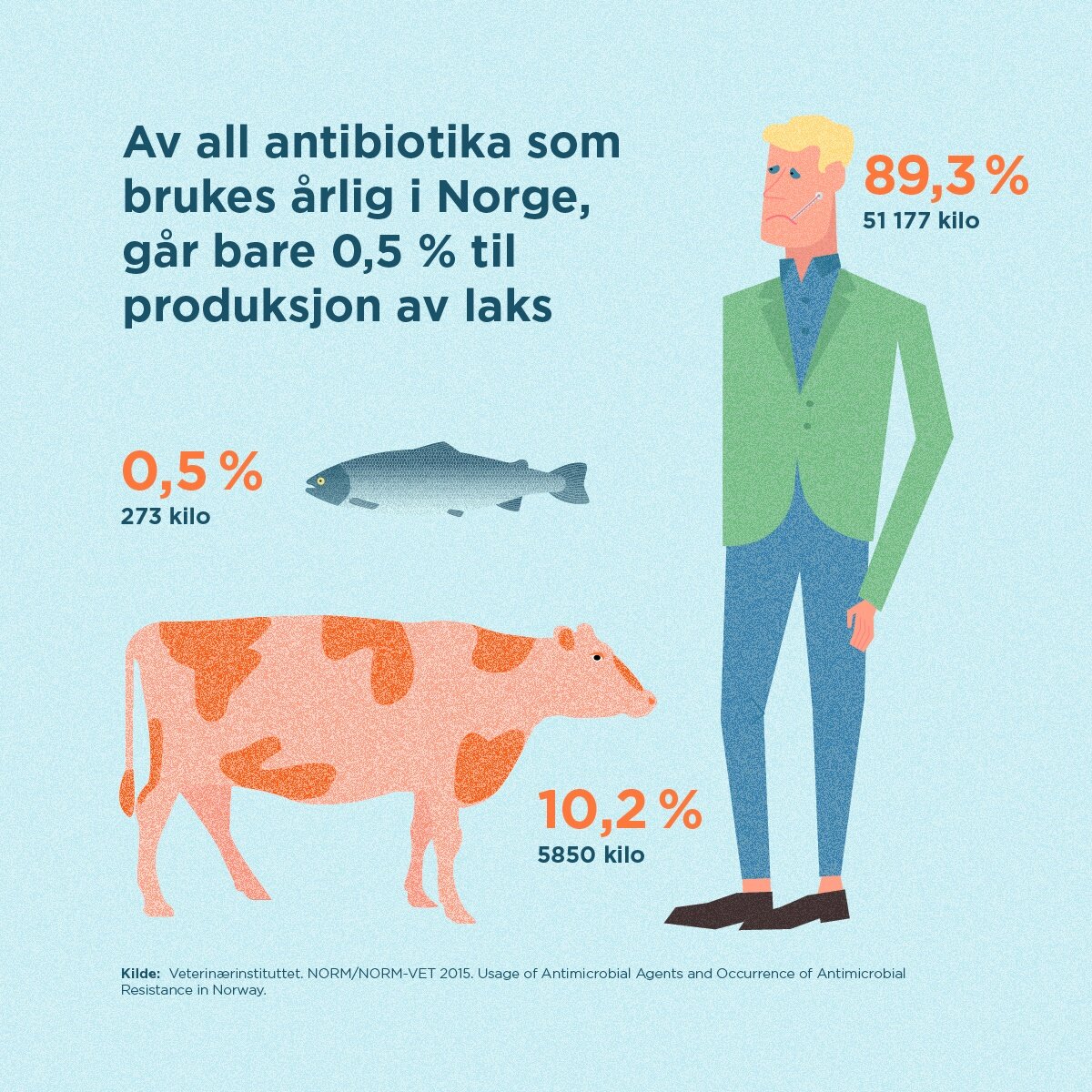 Det er godt dokumentert at det brukes svært lite antibiotika til oppdrettslaks i Norge. Veterinærinstituttet har hentet data fra Veterinært legemiddelregister hos Mattilsynet. De viser at det i 2016 kun ble foretatt behandling med antibiotika i fem lakseanlegg i sjøen, noe som tilsvarer at laks i mindre enn 1 prosent av anleggene ble behandlet med antibiotika.