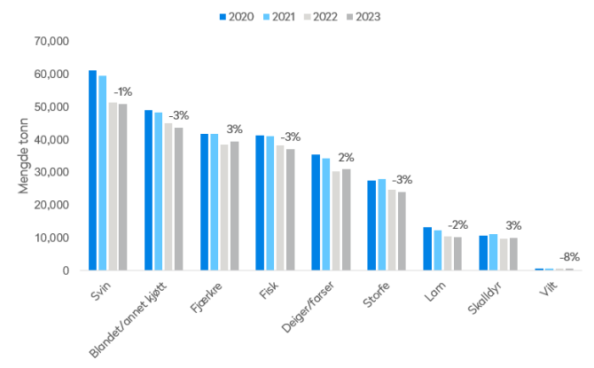 Fiskematen kjøpes hovedsakelig inn til dagligvare, men øker også innenfor storhusholdning. Laksen og torsken har nedgang både innenfor dagligvare og storhusholdning i 2023, mens reker gjør det godt i dagligvare.