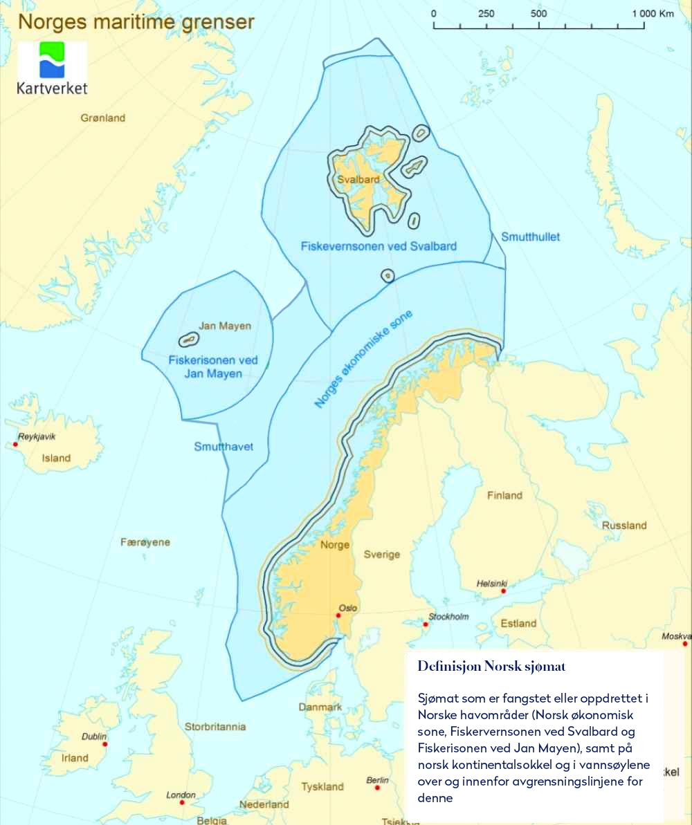 1. Sjømat som er fangstet eller oppdrettet i norske havområder (norsk økonomisk sone (NØS), Fiskevernsonen ved Svalbard og Fiskerisonen ved Jan Mayen), samt på norsk kontinentalsokkel og i vannsøylene over og innenfor avgrensningslinjene for denne (se kart), eller;