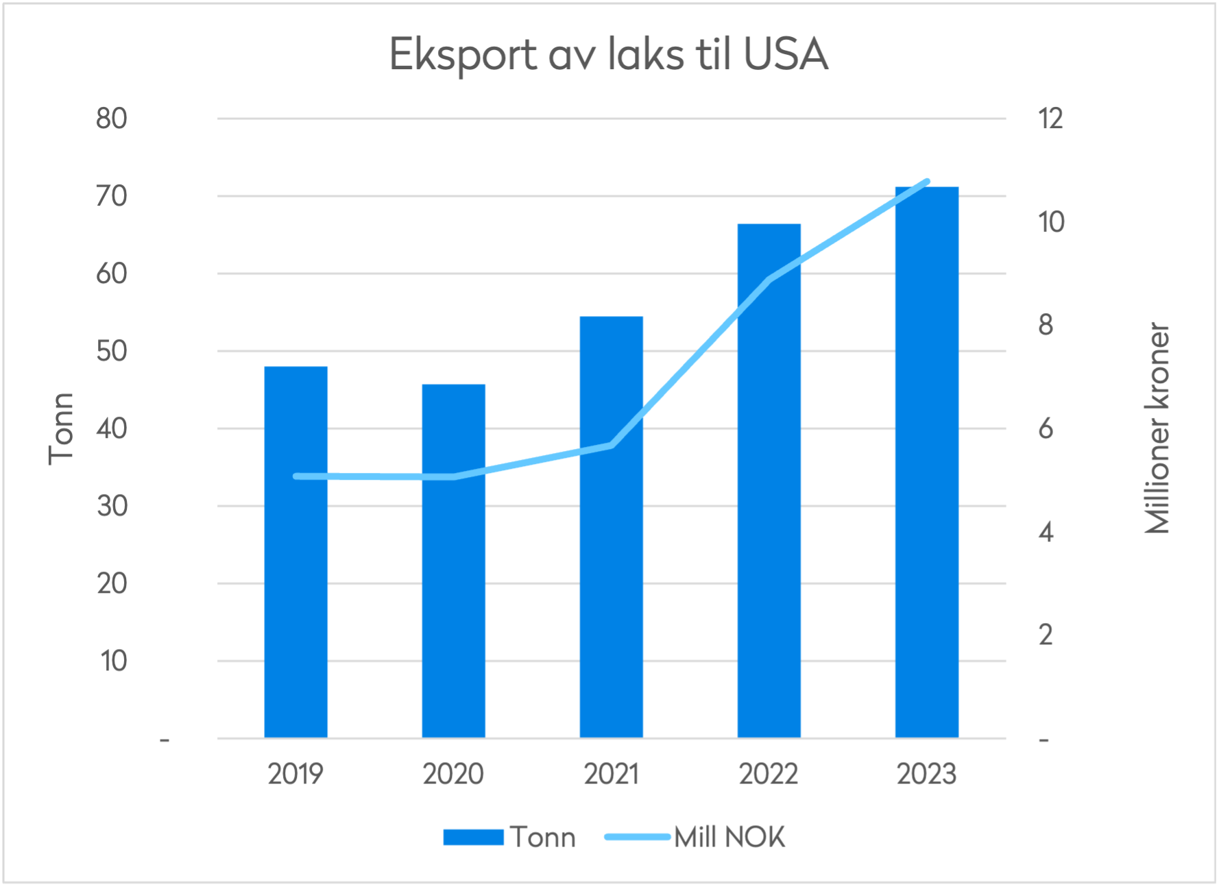 Laks er definitivt den viktigste arten som eksporteres fra Norge til USA. I 2023 endte totaleksporten av sjømat til USA på 116 000 tonn (+2%) til en verdi av 13,7 milliarder kroner (+18%). Av dette stod laksen for hele 71 000 tonn (+7%) til en verdi av 10,7 milliarder kroner (+21%).